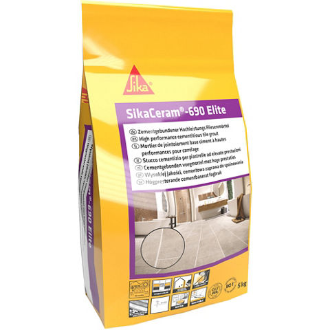 SikaCeram®-690 Elite е циментова прахообразна фугираща смес за стенни и подови плочки за използване във фуги с ширина от 1 mm до 10 mm. Специално проектирана за фугиране на плочки от гранитогрес, стъклокерамика и естествени камъни, чувствителни към обезцветяване. SikaCeram®-690 Elite има повишена устойчивост на цвета, много добра адхезия и повишена абразионна устойчивост. За вътрешна и външна употреба.