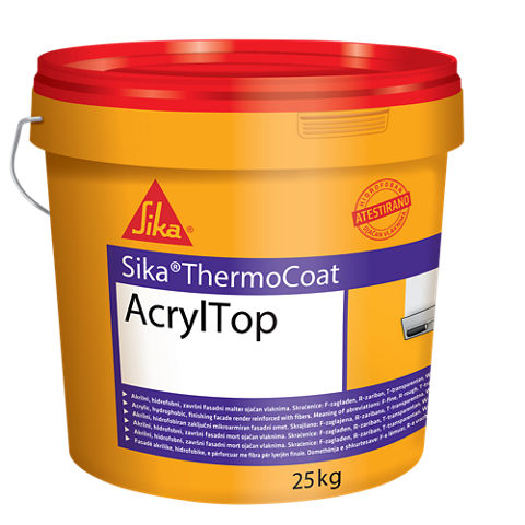 Sika® ThermoCoat Acryl Top е хидрофобна, акрилна фасадна мазилка, усъвършенствана и обогатена с хидрофобна силиконова добавка, армирана със специални фибри, предназначена за крайно, декоративно покритие при топлоизолационни системи. Произвежда се в бял цвят, но може да се оцветява в някой от цветовете, посочени в цветния каталог на Sika®.