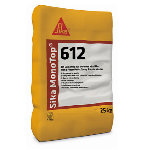 Sika MonoTop®-612 е 1-компонентен, армиран с фибри, структурен ремонтен разтвор, съдържащ микросилициев прах, който отговаря на изискванията на клас R4 съгласно EN 1504-3.